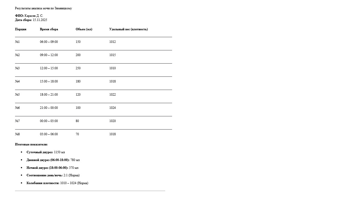 - Относительную плотность мочи — показатель концентрации растворённых веществ в каждой порции.