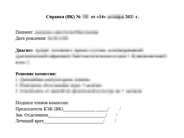 На КЭК нужно предоставить амбулаторную карту, все выписки, результаты анализов, эпикризы. Документы должны подтверждать диагноз и необходимость лечения. После того как комиссия примет решение, заполняют бланк, указывая в нем: