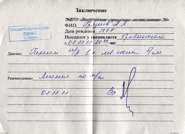 - Если необходимо зафиксировать повреждение. На бланке врач пишет диагноз, какая помощь оказана, рекомендации.